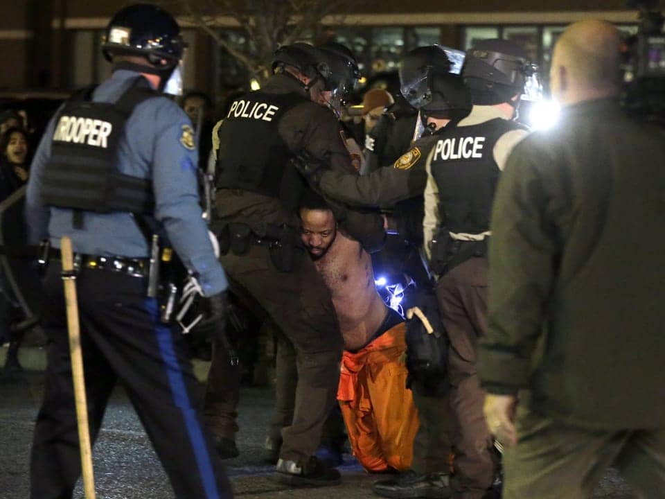 A man is arrested by police after kneeling in the street during a protest outside the Ferguson Police Department on Saturday, Nov. 29. – Photo: Jeff Roberson, AP